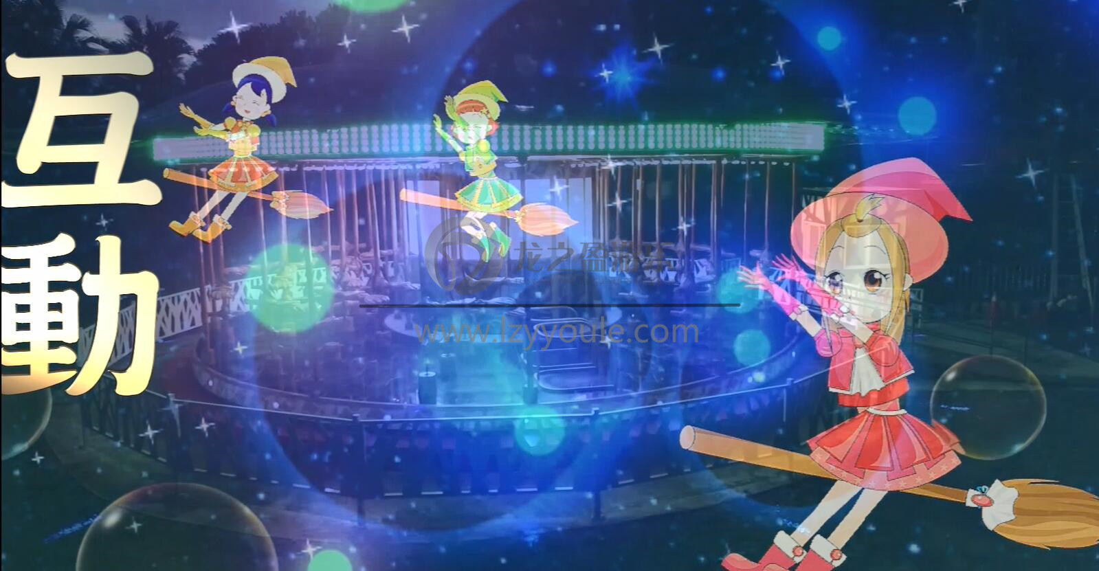 搭配中央顯示屏,結合精心華麗的天幕與地景,以及奇幻的煙霧、泡泡等特效,提供白天到黑夜的神奇魔法飛行體驗。